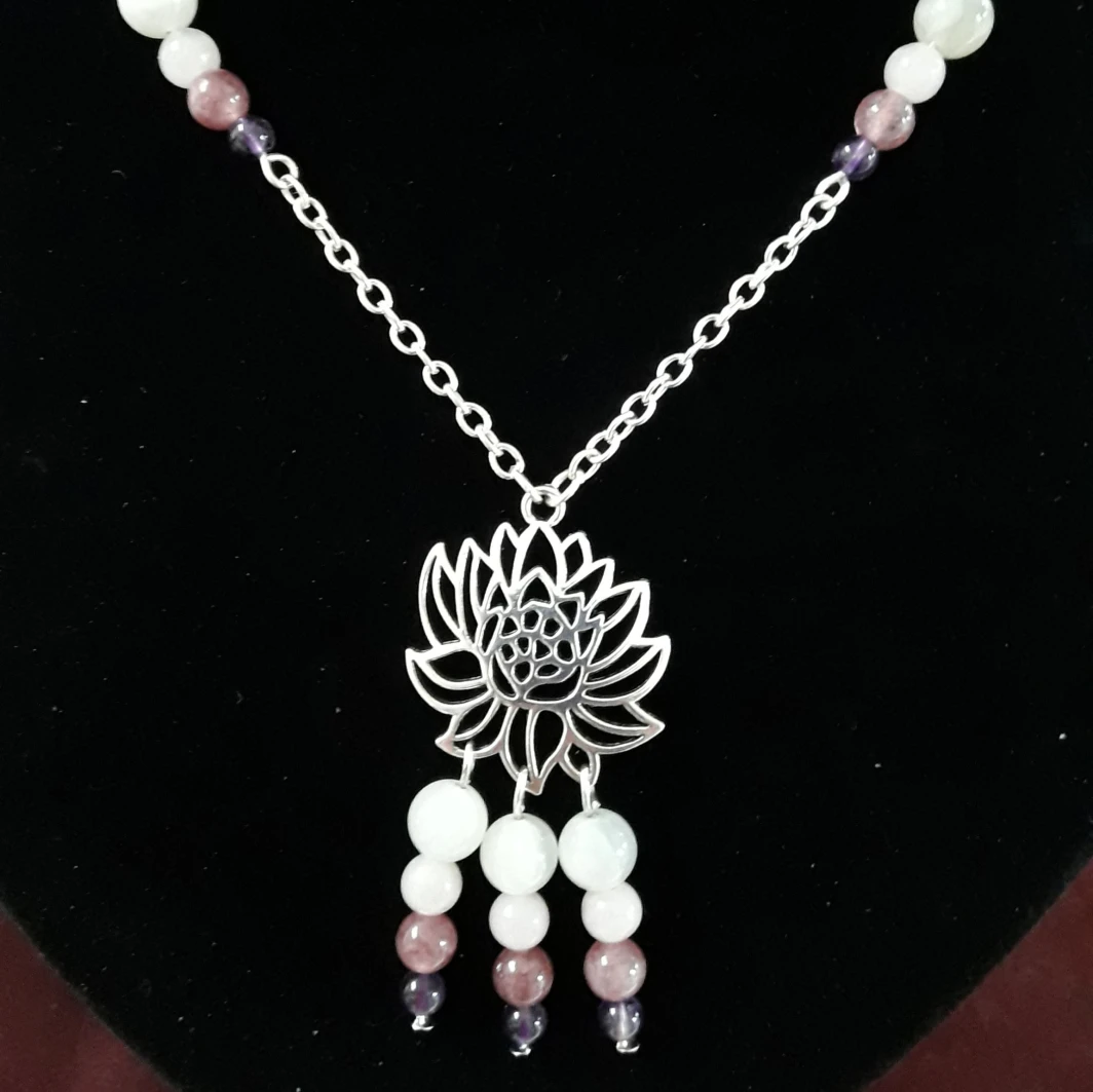 Sautoir "Lotus" en améthyste, lépidolite, quartz rose et pierre de lune